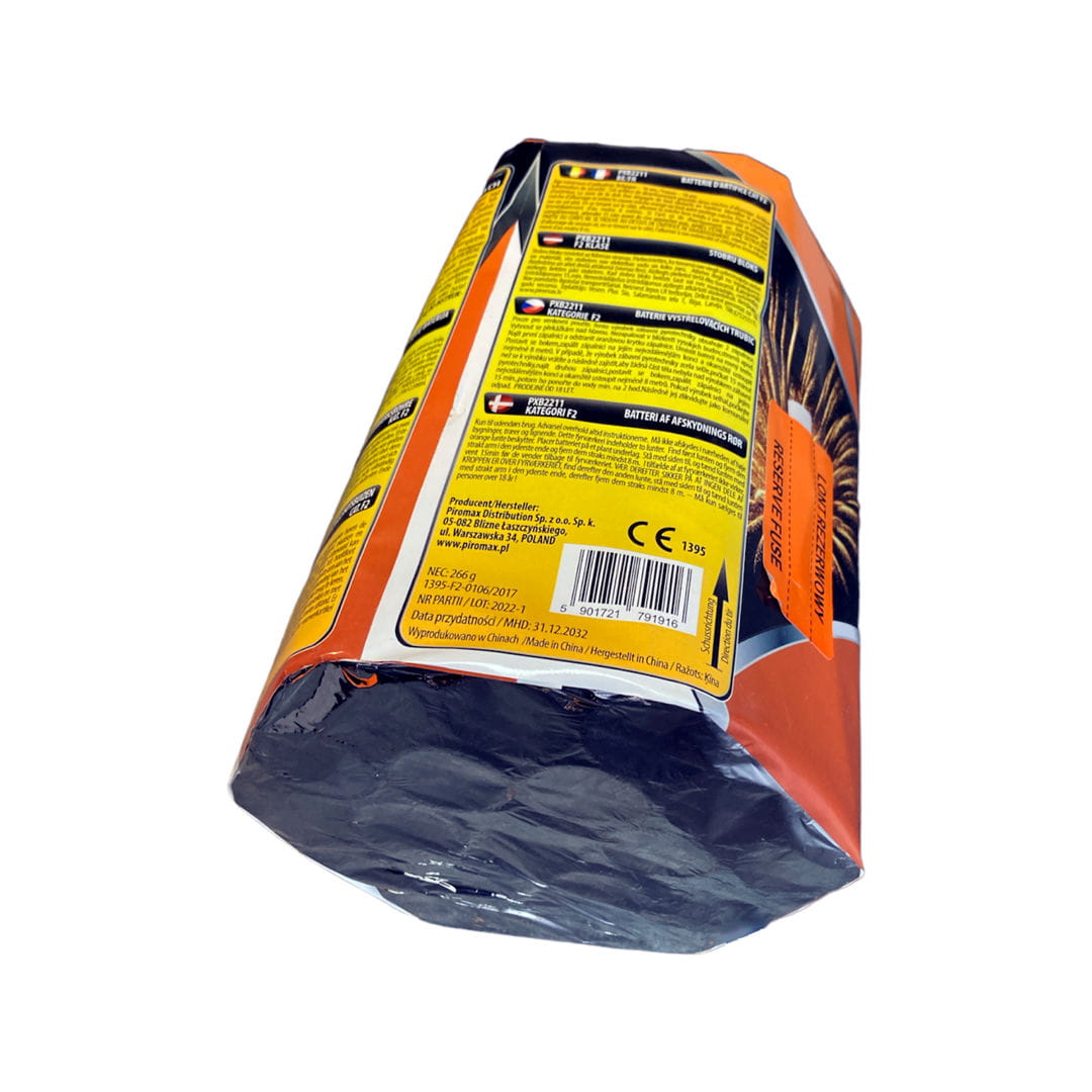 Klasyczny amatorski produkt średnich rozmiarów zawierający połączenie kolorowych efektów ze złotymi. Biorąc pod uwagę właściwości techniczne, z pewnością wyrzutnia ta stanowić będzie optymalny wybór na sylwestra lub prywatną imprezę (urodziny, rocznica itp.).