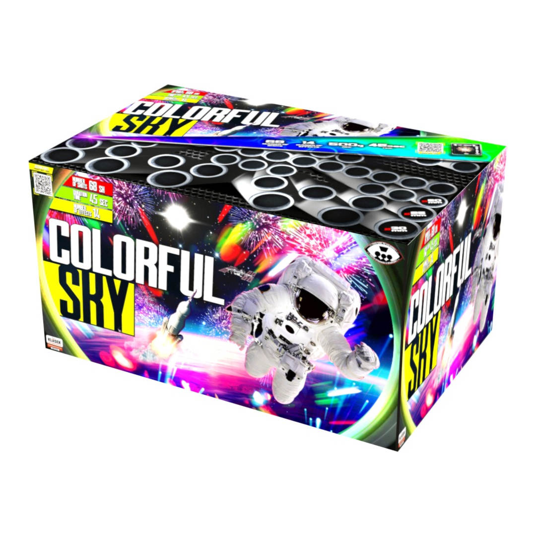 Bateria Corolful Sky, kod produktu C68XMCS14 od producenta pirotechniki Klasek. Wyrzutnia strzela w mieszanym układzie pionowym oraz kątowym. Kaliber ładunków o średnicy od 20 do 30 mm pozwala efektom wznosić się na pułap około 30 - 55 metrów w czasie około 40 sekund. Zawartość mieszaniny pirotechncznej netto (NEC) wynosi 500 g.