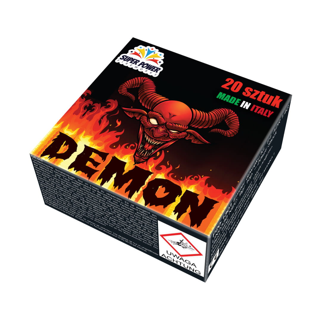 Zestaw głośnych emiterów dźwięku prod. włoskiej. Petardy Demon pomimo niewielkich rozmiarów (kaliber korpusu petardy 13 mm), gwarantują głośny huk. Efekt inicjowany jest poprzez potarcie draski. Opakowanie zawiera 20 szt. Łączna masa netto mieszaniny pirotechnicznej (NEC) wynosi 9 g (0,45 g/szt).