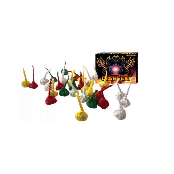 Diabełki kolorowe kod produktu: TXP082A - 50 sztuk diabełków od importera Triplex. Diabełki cieszą się szczególnym zainteresowanie wśród najmłodszych. Ten popularny produkt nie wymaga użycia ognia w celu uzyskania efektu. Wystarczy rzucić takim diabełkiem o podłoże i w rezultacie usłyszymy trzask.Produkt posiada certyfikat CE: Klasa F1