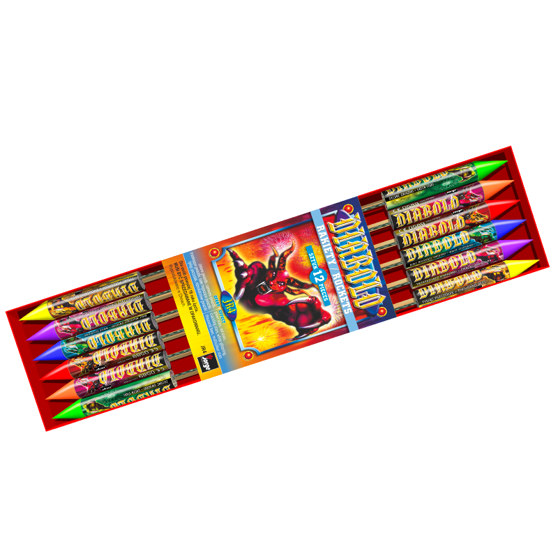 Zestaw popularnych rakiet Diabolo JR4 od importera Jorge. Opakowanie zawiera 12 sztuk małych rakiet o sześciu różnych kompozycjach.