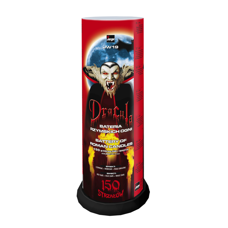 Dracula JW19 to 150 - strzałowa wyrzutnia rzymskich ogni marki Jorge. Ładunki o śr. 7 mm dynamicznie wzlatują w układzie pionowym. Zawiera mix kolorowych gwiazdek wzlatujących na wysokość 15 metrów. Łączny czas działania wynosi około 25 sekund.