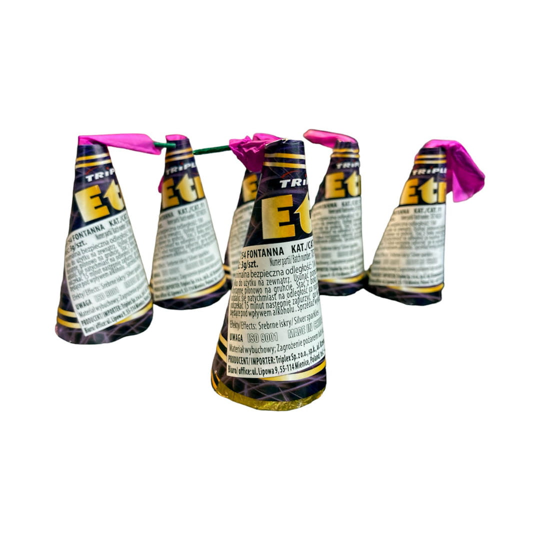 Zestaw 6 małych fontann Etna TXF754 od producenta TRIPLEX. Zestaw sześciu małych fontann stożkowych z jednolitym efektem. Czas działania 1 fontanny wynosi ok. 10 sekund. Masa netto mieszaniny pirotechnicznej sztuki (NEC) wynosi 18 g.