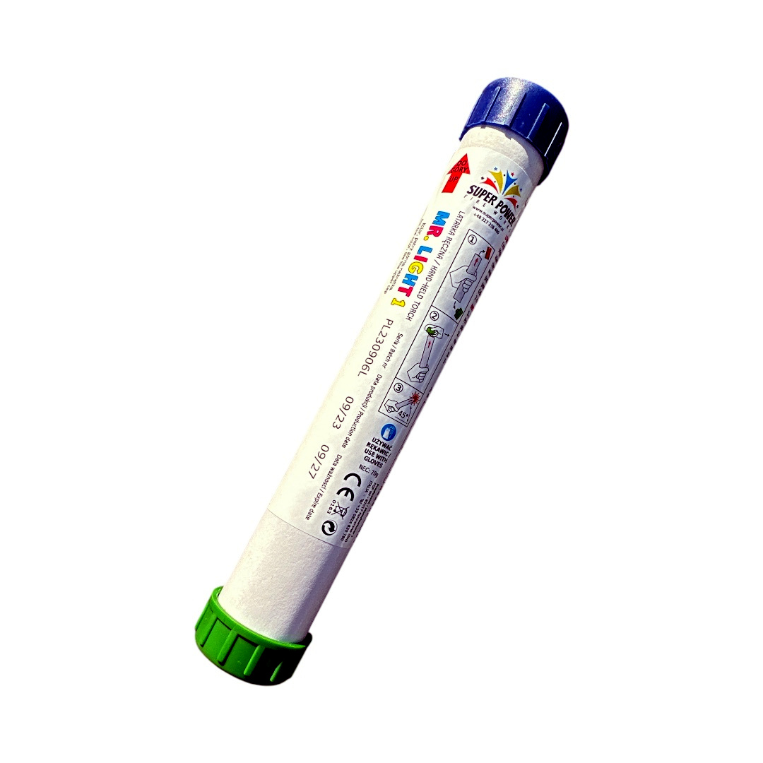 Raca świetlna "Mr. Light 1" FDF produkcji włoskiej w kolorze niebieskim. Zbudowana w korpusie o lekkiej masie. Efekt inicjowany jest poprzez potarcie draski zmadującej się po przeciwnej stronie korpusu.
