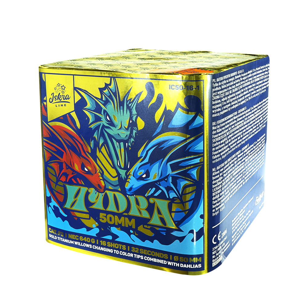 Bateria najwyżego możliwie kalibru (50 mm) Hydra to produkt marki Iskra Line, który charakteryzuje się złotymi wolno opadającymi kompozycjami o bardzo dużym rozmachu. Bateria zawiera 16 strzałów, czas prezentacji wynosi ok. 32 sekund. Zawartość mieszaniny pirotechnicznej netto (NEC) wynosi 640 g.