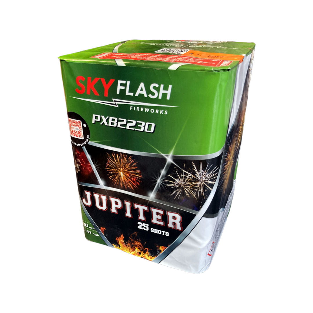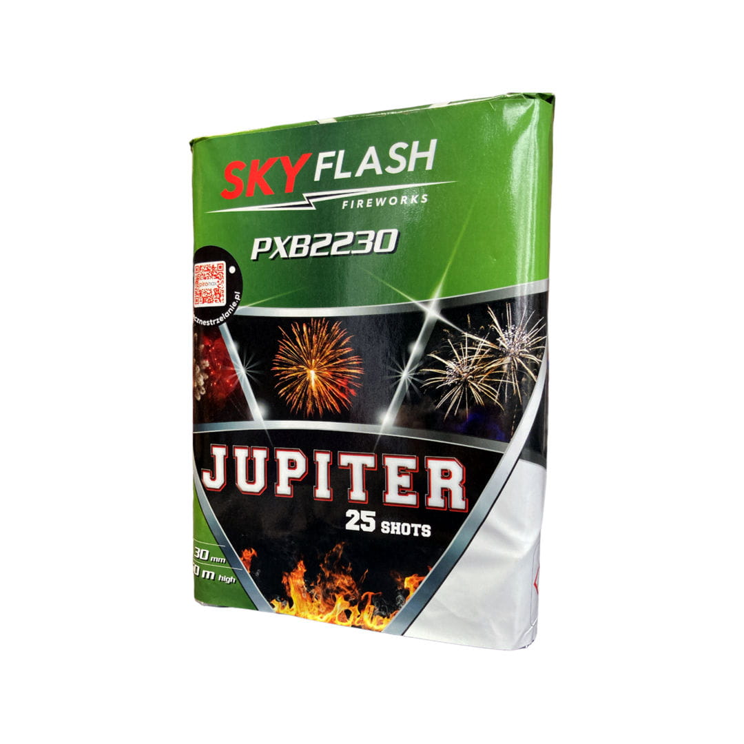 25 - strzałowa wyrzutnia Jupiter (kod produktu: PXB2230) od dystrybutora pirotechniki "Piromax" z długim czasem strzelania. Ładunki wzlatują pojedynczo w układzie pionowym, prezentując "mix" efektów. Kaliber o średnicy 30 mm powoduje rozkład kompozycji na wysokości około 60 metrów. Czas prezentacji wynosi 40 sekund.