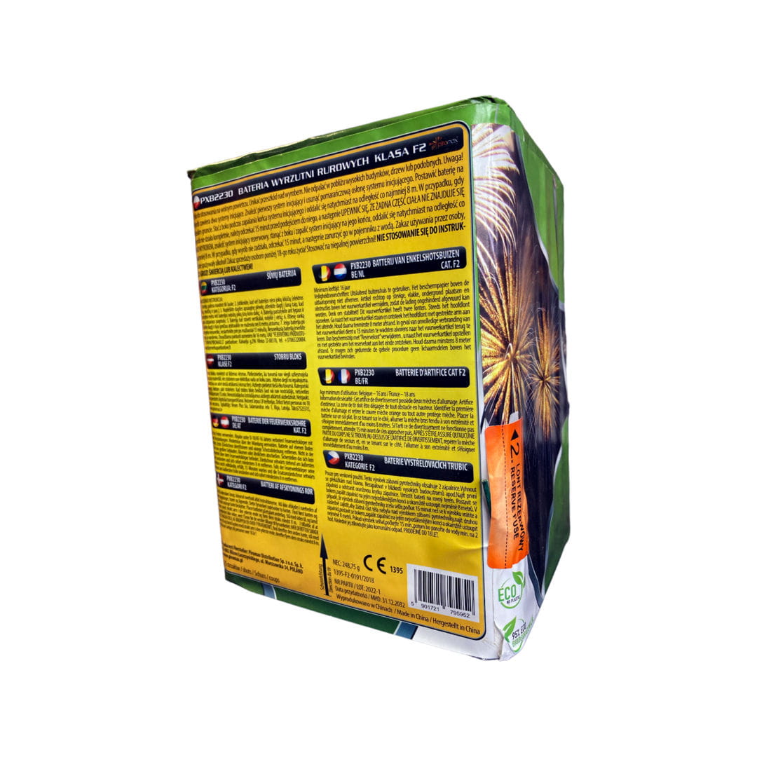 Klasycznej budowy bateria 25-strzałowa dużego kalibru. Może stanowić element amatorskiego pokazu lub być dodatkiem do produktów o szybszej dynamice strzelania.
