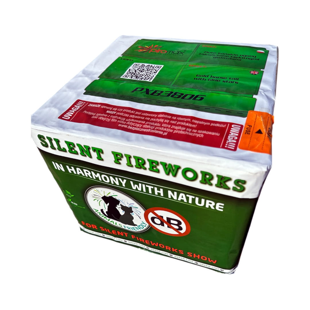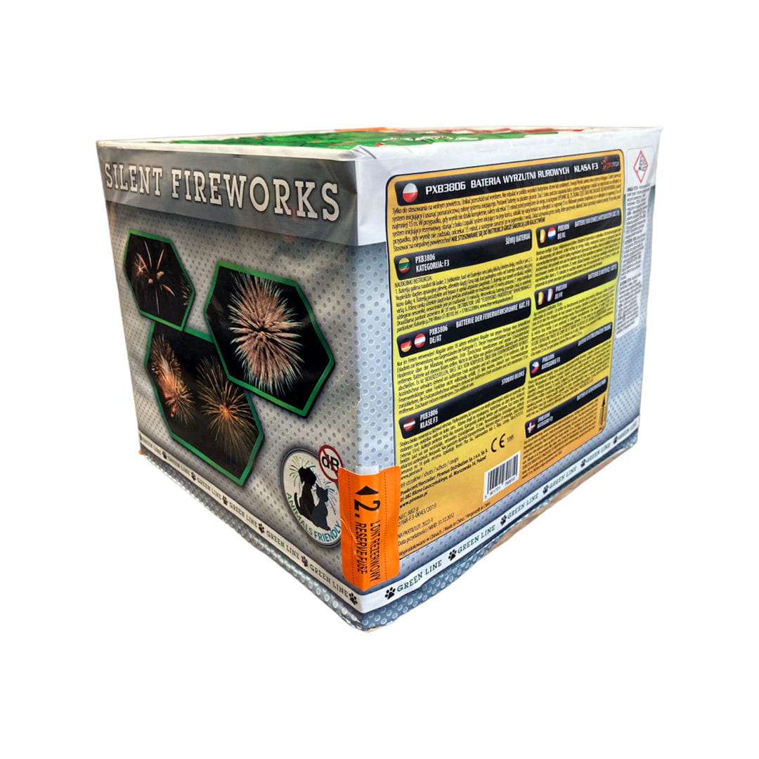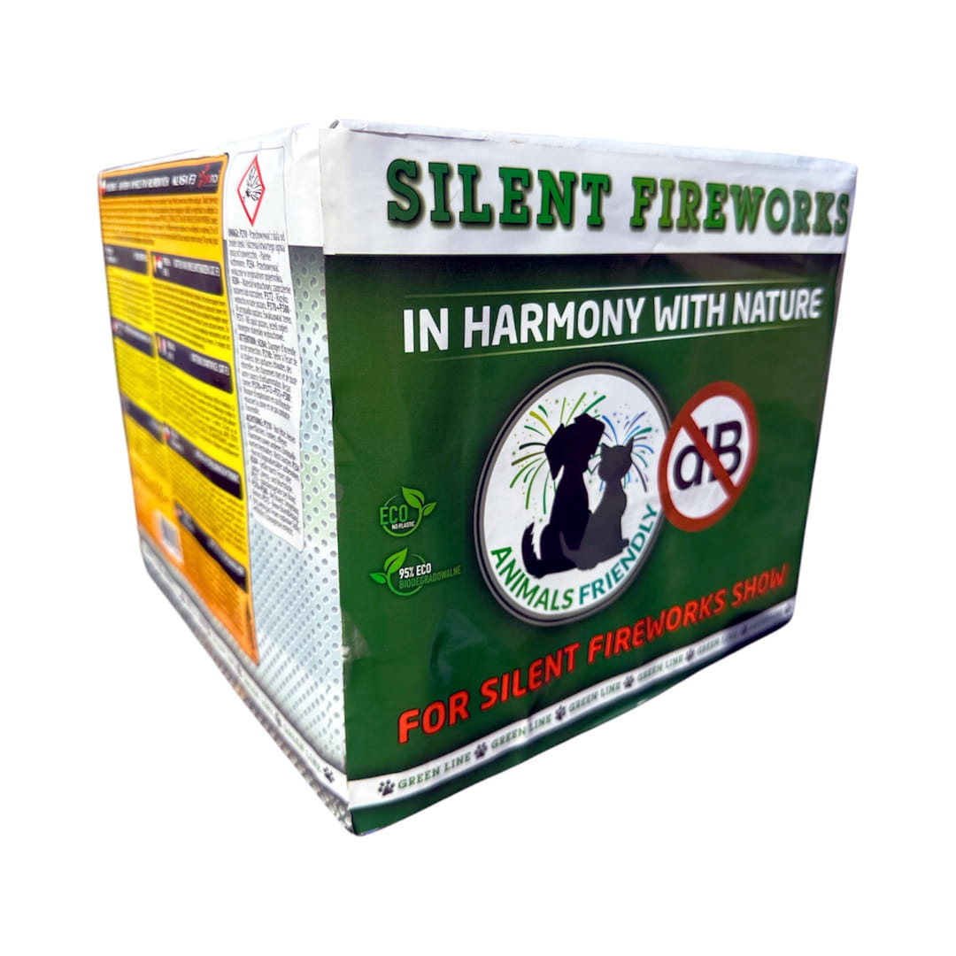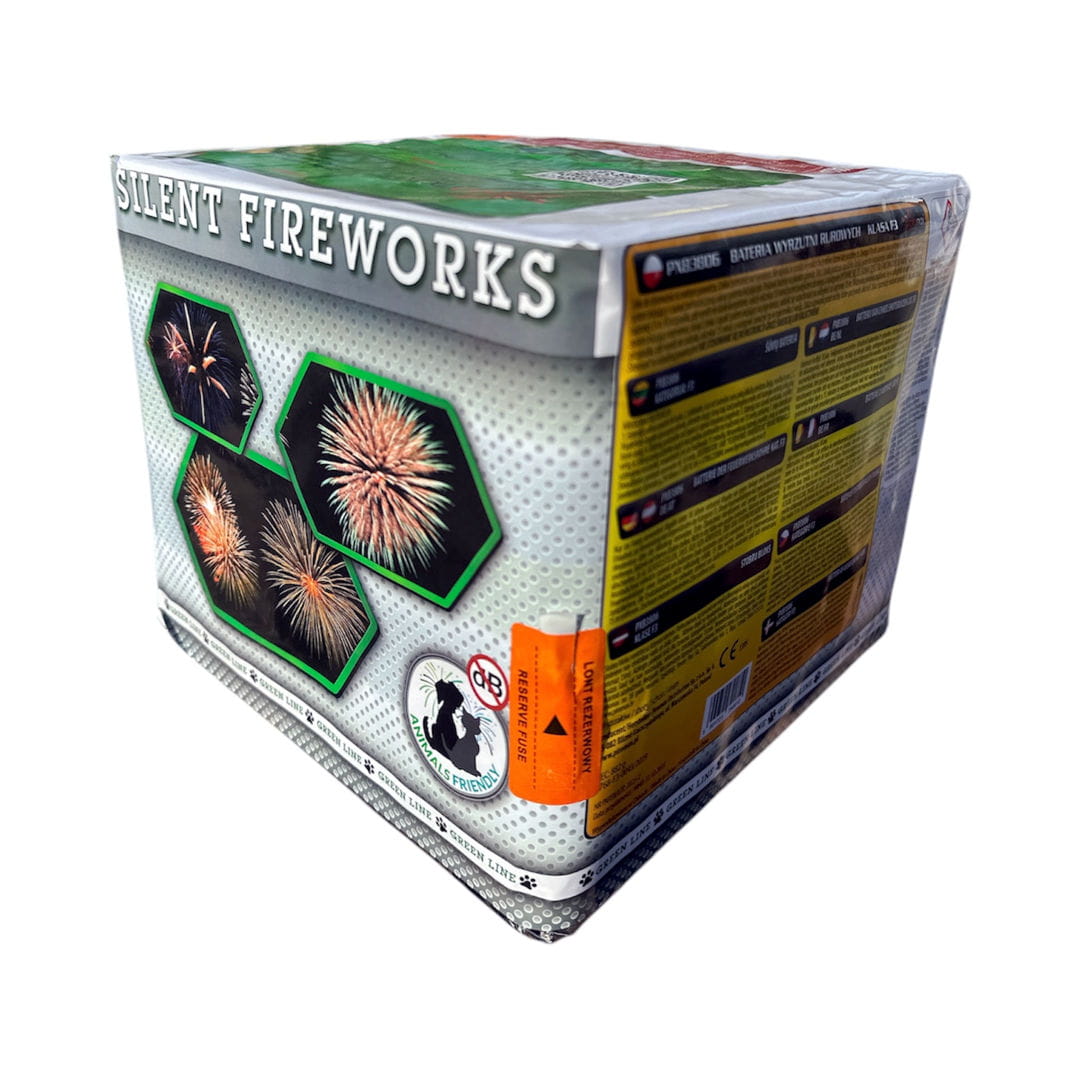 Wyrzutnia serii Silent Fireworks producenta "Piromax" strzelająca w układzie pionowym z jednolitym efektem. Czas prezentacji wynosi około 20 sekund. Zawartość mieszaniny pirotechnicznej (NEC) wynosi 882 g.
