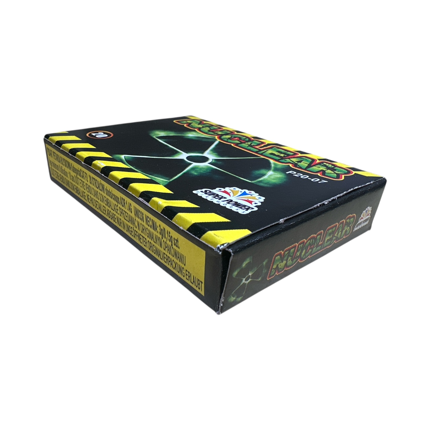 Zestaw małych petard lontowych Nuclear marki Super Power. Efekt inicjowany jest poprzez podpalenie zielonego lontu wolnopalnego. Opakowanie zawiera 20 szt.