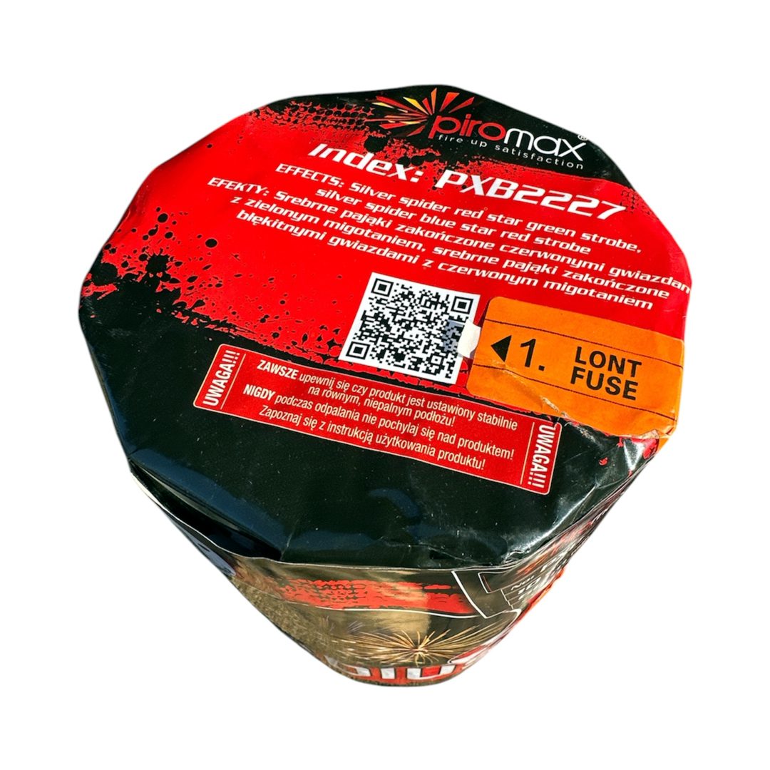 10 - strzałowa wyrzutnia "Radius" (kod produktu: PXB2227) od dystrybutora pirotechniki "Piromax" ze zmiennymi kompozycjami.