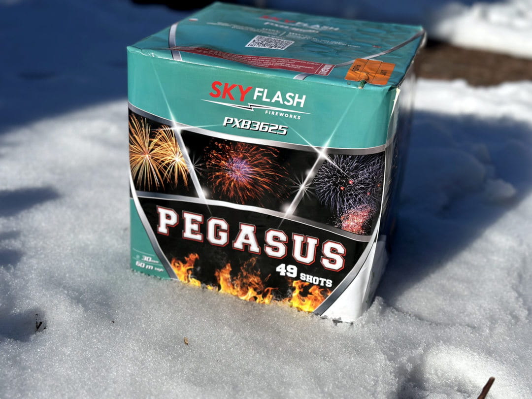 49 - strzałowa wyrzutnia Pegasus PXB3625 od dystrybutora pirotechniki "Piromax" z efektami o dużej rozpiętości. Jest to kolejna bateria z popularnej serii SKY FLASH tego producenta. Ładunki wzlatują pojedynczo w układzie pionowym. Czas prezentacji wynosi ok. 40 sekund.