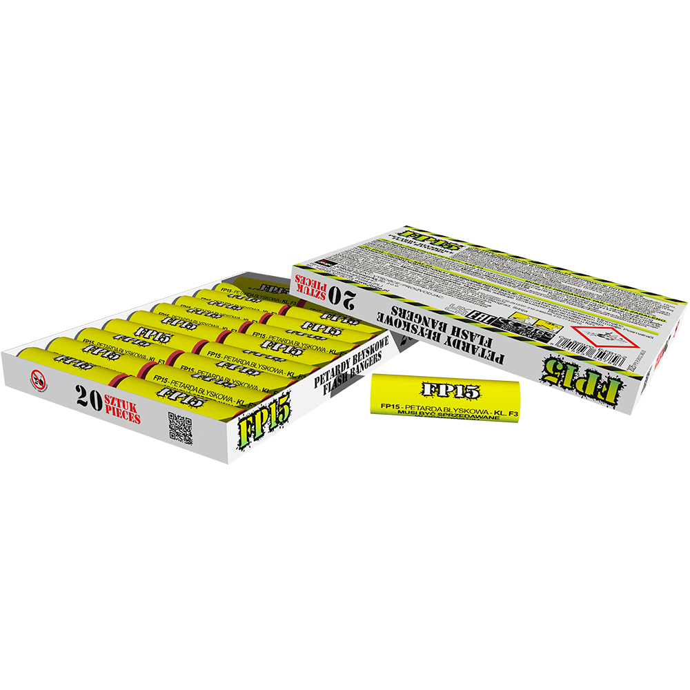 Zestaw 20 mocnych petard FP15 Flash Bangers od importera JORGE. Opakowanie zawiera 20 petard lontowych. Masa mieszaniny pirotechnicznej netto (NEC) wynosi 0,8 g (szt.)