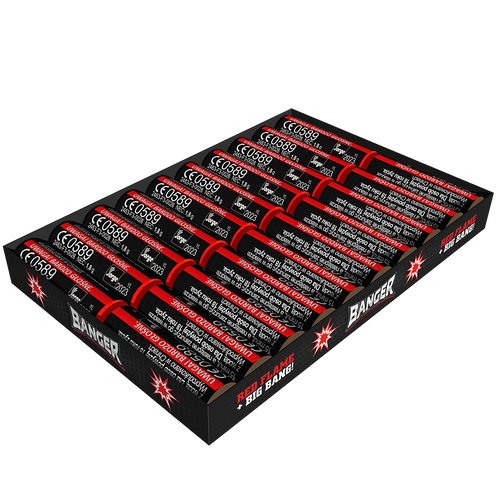 Zestaw 20 mocnych petard FP3/R Banger od importera JORGE. Opakowanie zawiera 20 petard lontowych, gdzie huk poprzedzony jest bardzo jasnym rozbłyskiem czerwonej flary.