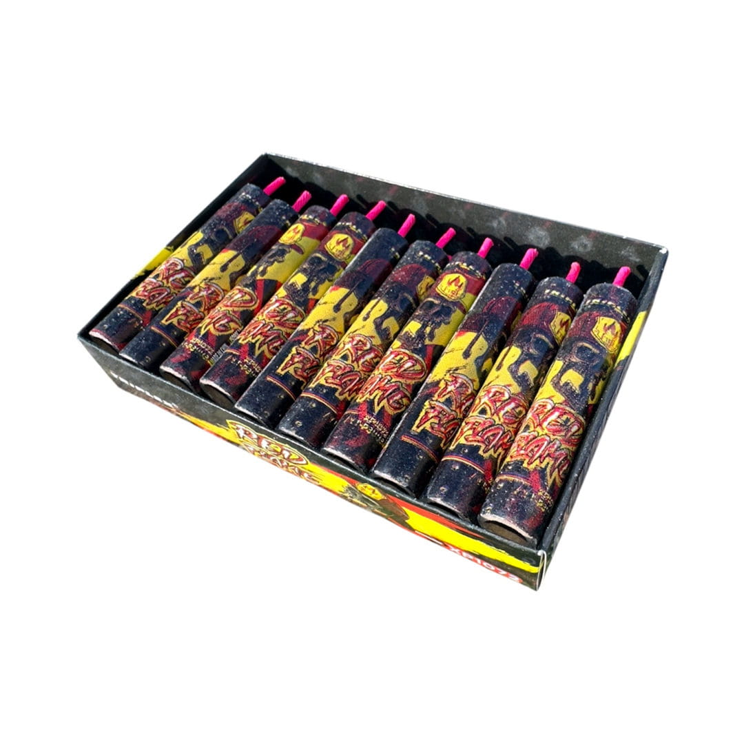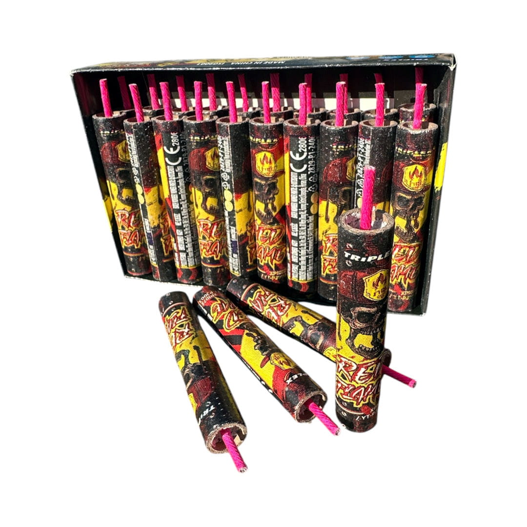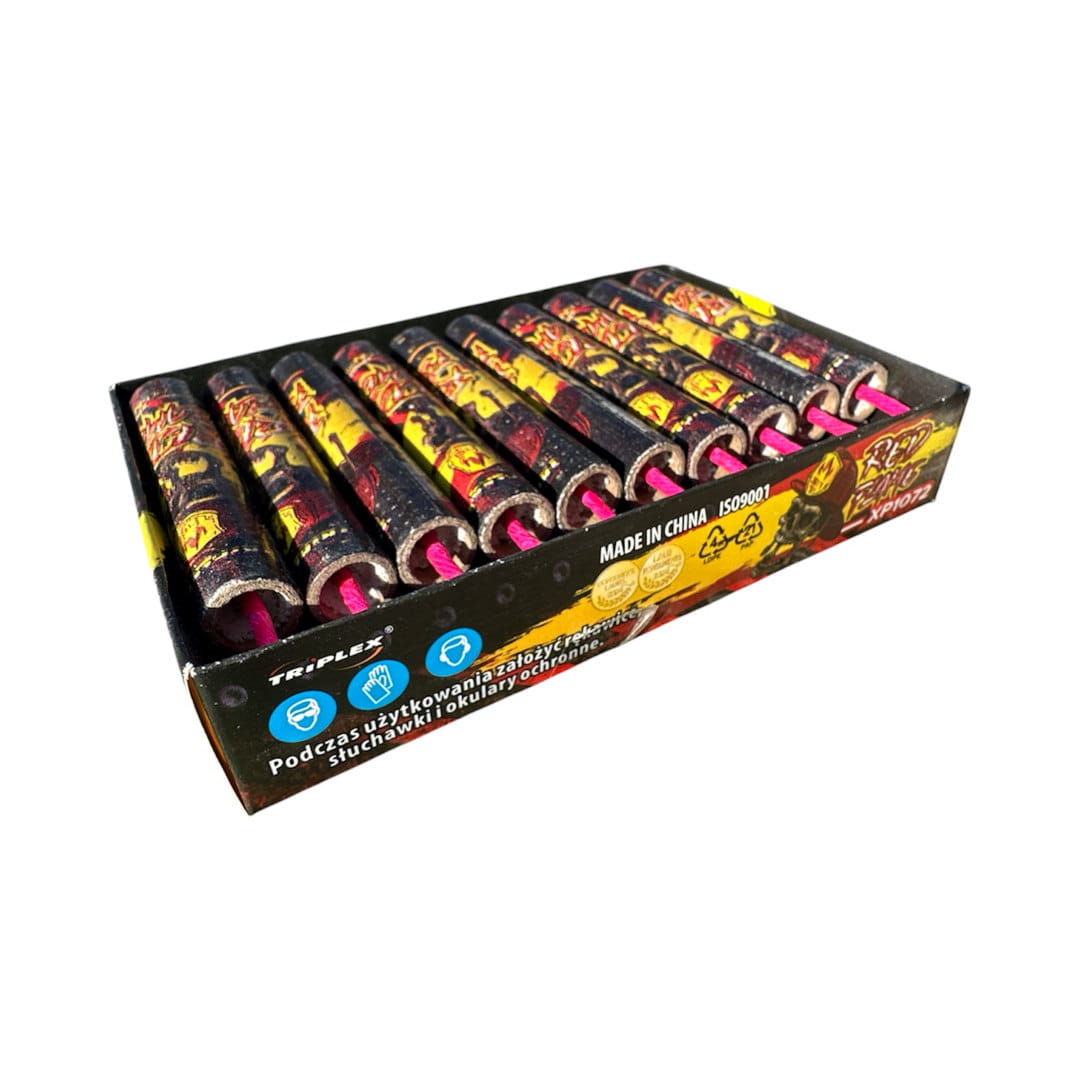 Zestaw mocnych petard lontowych Red Flame marki Triplex. Kod produktu: XP1072. Opakowanie zawiera 20 szt. Jest to produkt klasy bepzieczeństwa P1, co oznacza że są to mocne tzw. emitery dźwięku przeznaczone przede wszystkim do odstraszania zwierzyny. Cechą charakterystyczną tych petard jest ozdobny lont wolnopalny, który podczas spalania emituje jaskrawy czerwony płomień.
