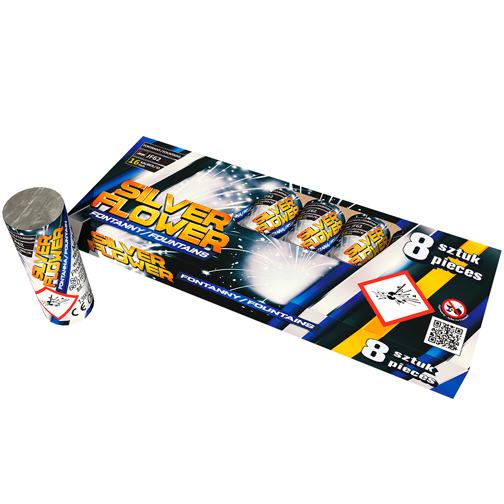Zestaw małych fontann cylindrycznych Silver Flower JF62 to produkt, który pojawił się na rynku w roku 2025. Zawiera 8 produktów o tej samej kompozycji. Czas prezentacji efektu wynosi ok. 15 sekund.