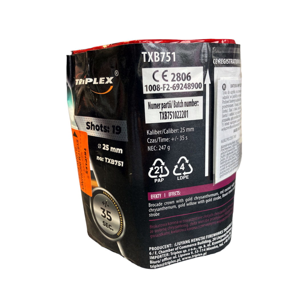 Bateria ta prezentuje różnorodne efekty. Bardzo widowiskowa kompozycja, która z pewnością zadowoli wielu użytkowników. Polecamy zwrócić uwagę na ten produkt np. jako jeden z elementów efektownego pokazu sylwestrowego bądź na imprezie okolicznościowej.