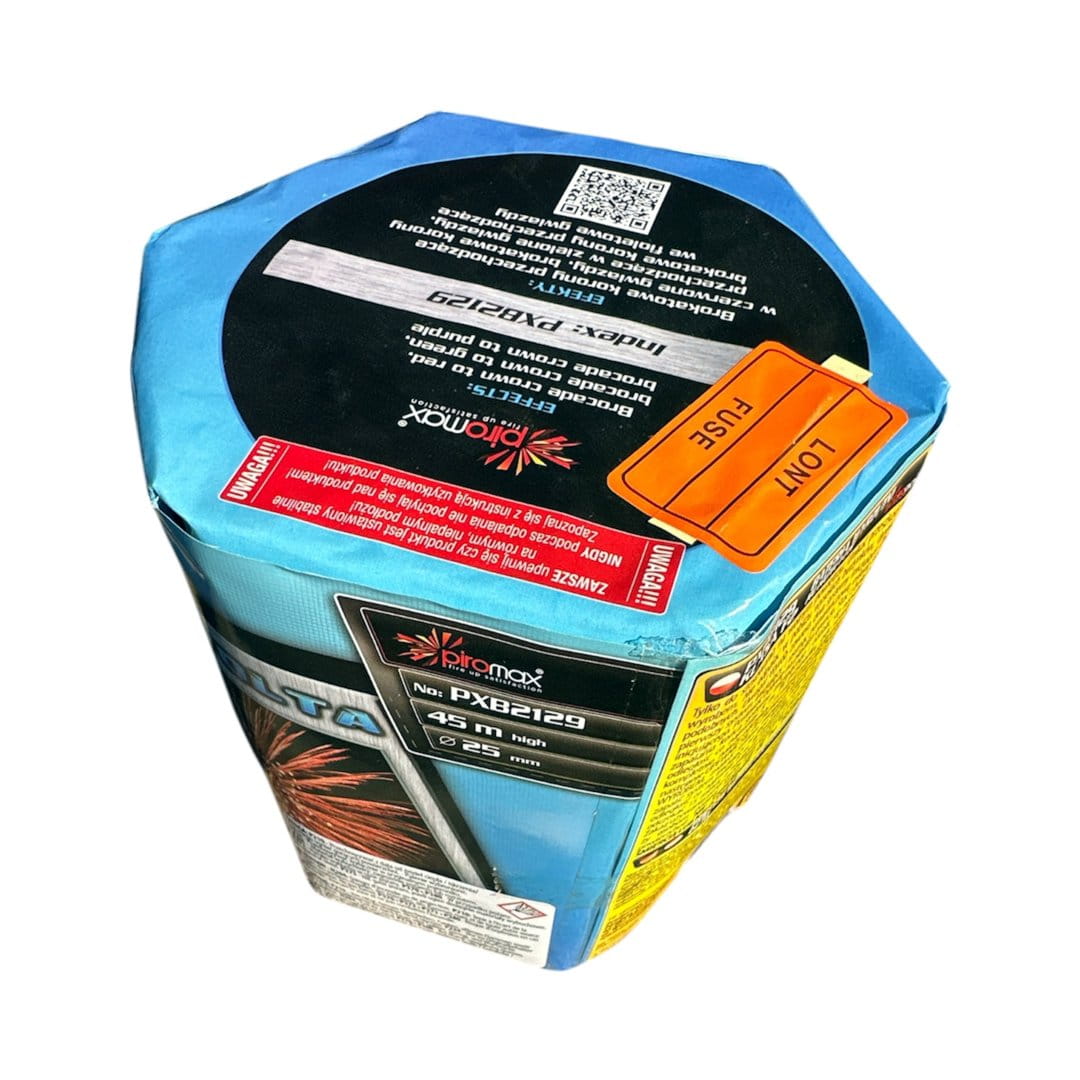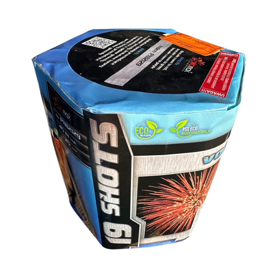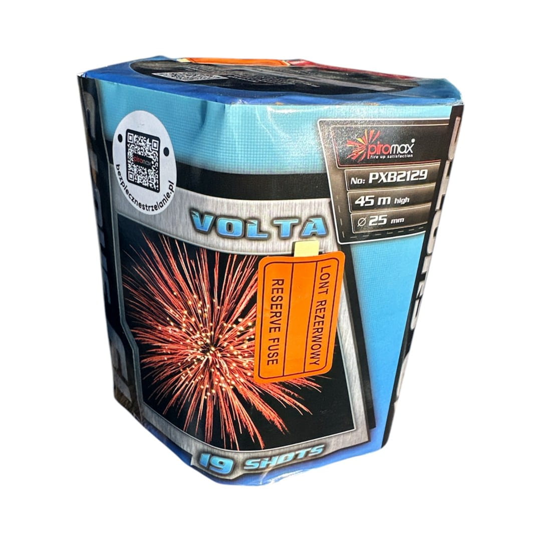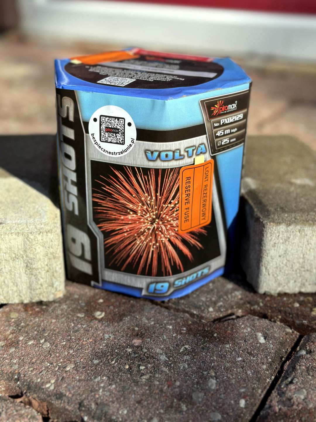 19 - strzałowa wyrzutnia PXB2129 "Volta" strzelająca pionowo od producenta "Piromax". Przeważającą kompozycją tego produktu są brokatowe opadające korony. Kaliber ładunków o średnicy 25 mm pozwala efektom wznosić się na pułap około 40 metrów w czasie ok. 20 sekund.