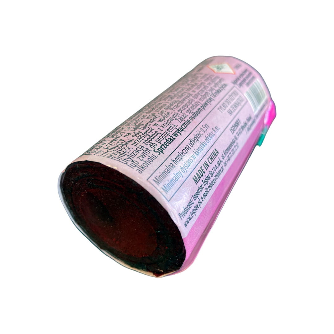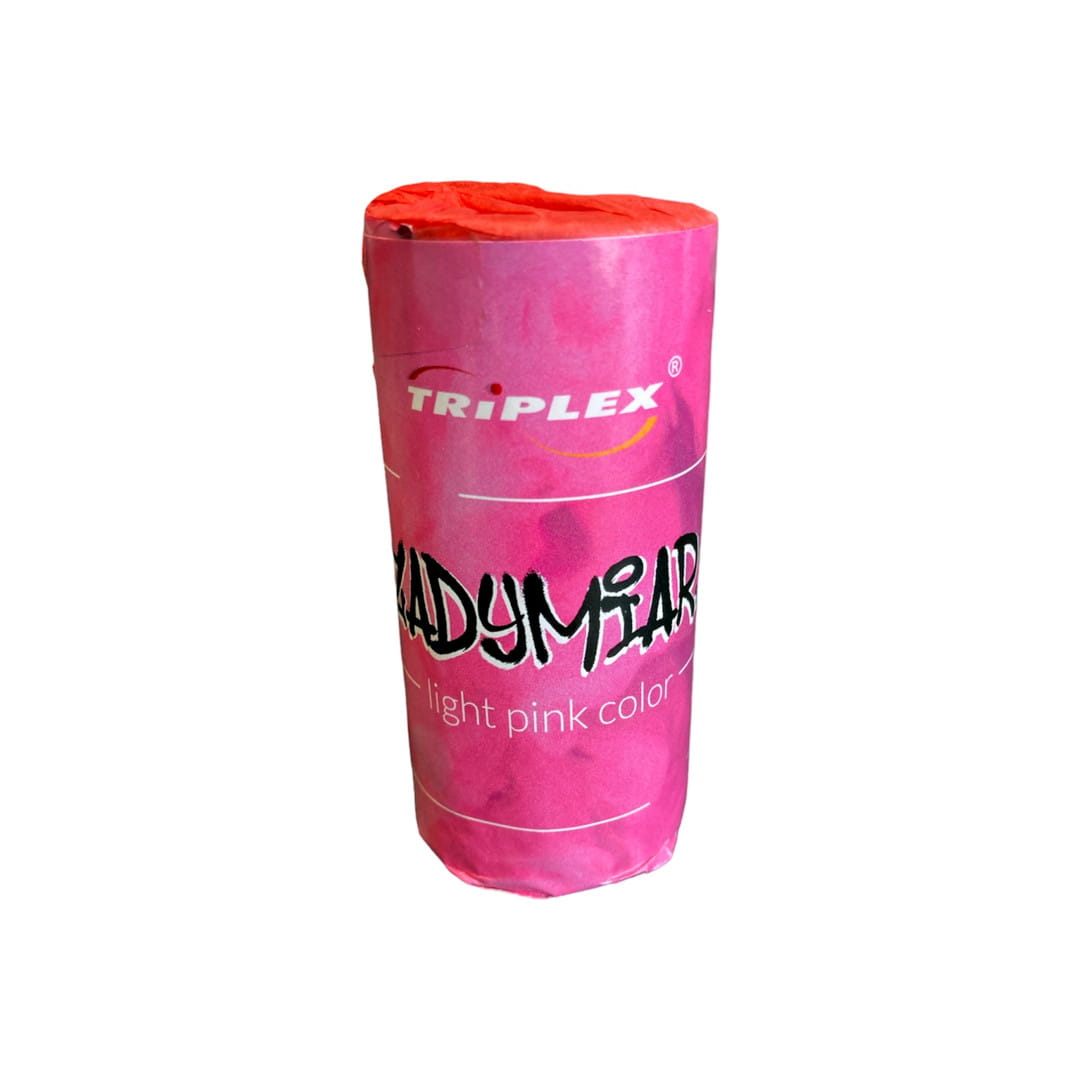 Świeca dymna od producenta TRIPLEX w kolorze jasnoróżowym. Świeca dymna odpalana za pomocą zielonego lontu. Produkt generuje gęsty dym w czasie ok. 50 sekund. Masa netto mieszaniny pirotechnicznej (NEC) wynosi 25 g.