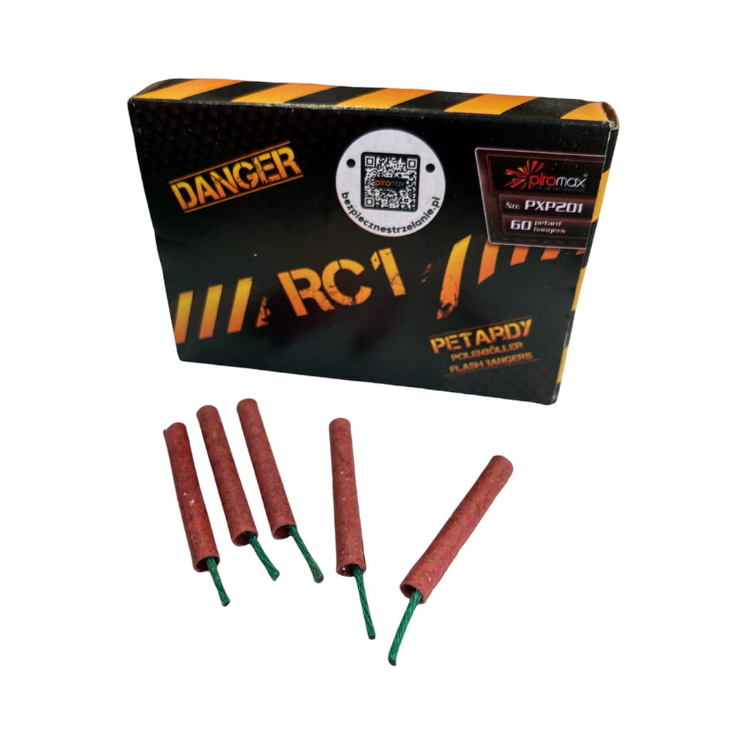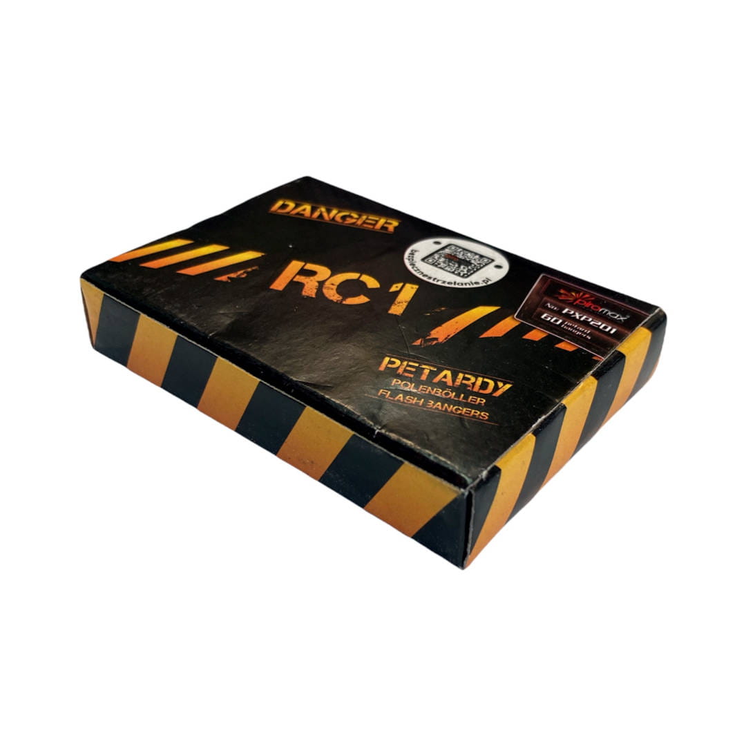 Zestaw petard PXP201 "RC 1" od producenta PIROMAX, zawiera 10 opakowań x 60 petard lontowych. 1 opakowanie zawiera 60 sztuk. Masa netto mieszaniny pirotechnicznej (NEC) wynosi 0,07 g/szt.